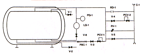This container is equipped with an integral pressure building system to aid in liquid withdrawal. The pressure-building system consists of the pressure- building coil (PBC-1), the pressure-building valve (V-3, located at the bottom right) and the pressure-building regulator (PCV-1, located at the bottom of the vent manifold) all connected in series.