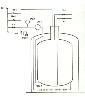 The container consists of an inner stainless steel cylinder securely supported in an outer jacket shell. The space between the inner and outer vessels contains a highly efficient insulation material and is evacuated. The container has four (4) valves: A liquid valve (V-1), a full trycock valve (V-2), a pressure building valve (V-3), and a vent valve (V-4). A pressure-building regulator (PVC-1) is located in series with the pressure-building valve.