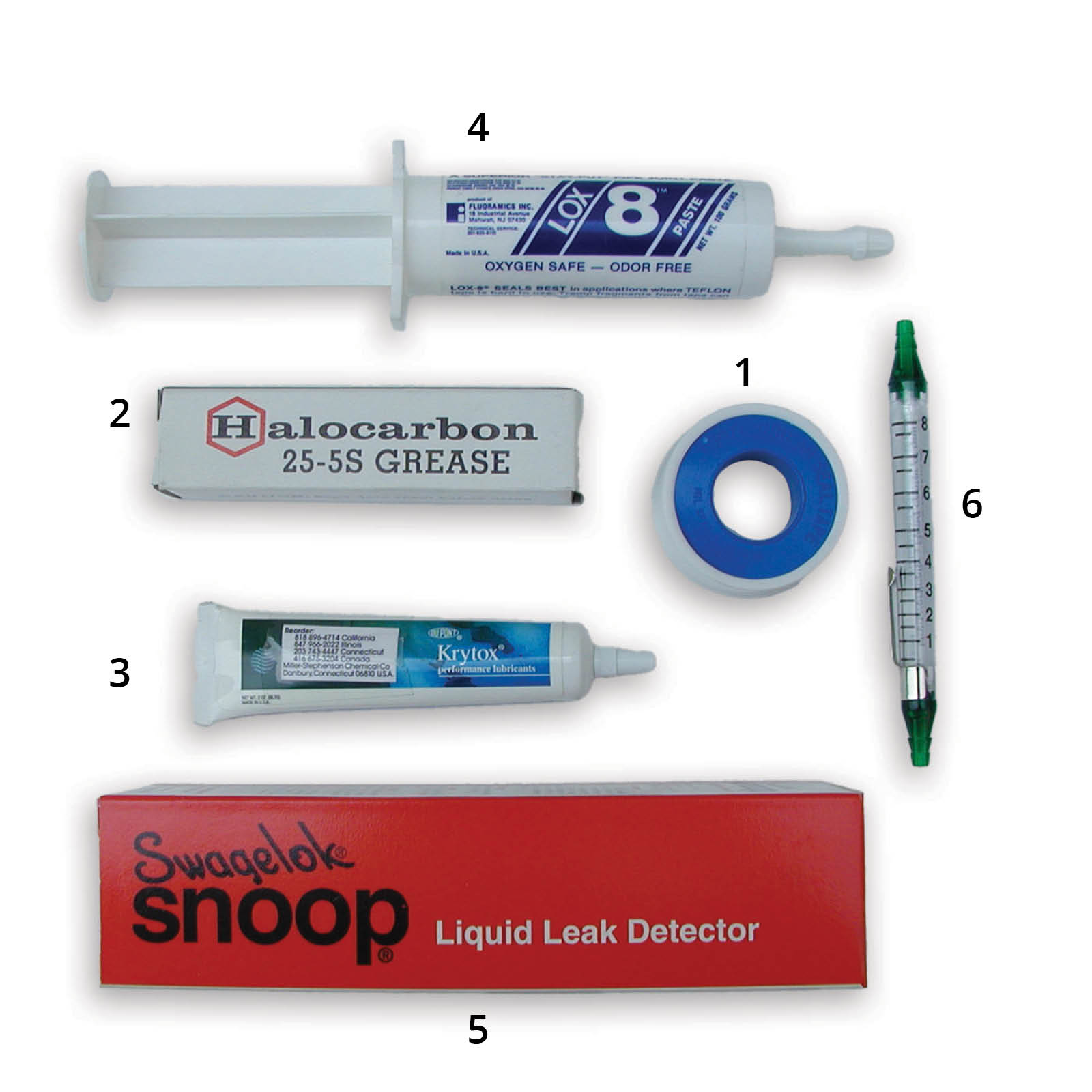 Lox 8® is a registered trademark of Fluoramics, Inc.; Halocarbon® is a registered trademark of Halocarbon Products Corp.; Krytox® is a registered trademark of Dupont; Snoop® is a registered trademark of Swagelok Co.; Magliner® is a registered trademark of Magline, Inc.