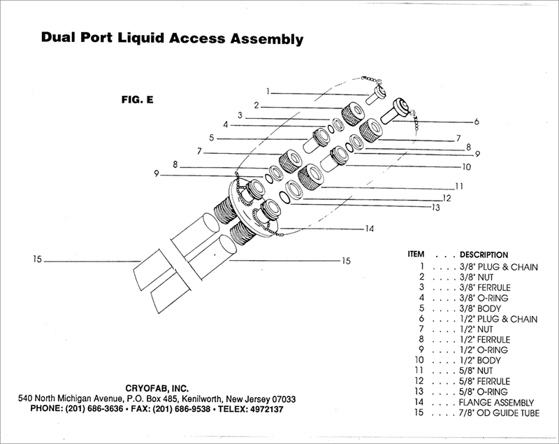 Order complete access port assembly or component parts for Cryofab CMSH liquid helium storage dewars including couplings, o-rings and seals and more. You can trust replacement parts from Cryofab. Select the access port that fits your liquid helium dewar, Figure A for containers that hold 150 liters or less, Figure D for containers 250-liter size or larger, Figure E features dual access ports, Figure F for S models intended for transport. Expanded schematics below.